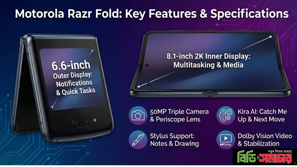 নতুন বছরের শুরুতেই প্রযুক্তি দুনিয়ায় বড় চমক নিয়ে হাজির হয়েছে মোটোরোলা। তাদের নতুন ফোল্ডেবল স্মার্টফোন ‘Motorola Razr Fold’ বর্তমানে টেক প্রেমীদের আলোচনার কেন্দ্রে। ৮.১ ইঞ্চির বিশাল ডিসপ্লে, ট্রিপল ৫০ মেগাপিক্সেল ক্যামেরা এবং উন্নত ‘কিরা’ (Kira) এআই প্রযুক্তির সমন্বয়ে এই ফোনটি স্মার্টফোন ব্যবহারের অভিজ্ঞতাকে সম্পূর্ণ বদলে দিতে প্রস্তুত।